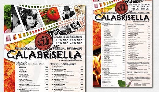 Mehrere Flyer für die Pizzeria "Calabrisella" aus Maintal-Bischofsheim, hausgemachte Nudeln und im Holzofen gebackene Pizzagerichte.