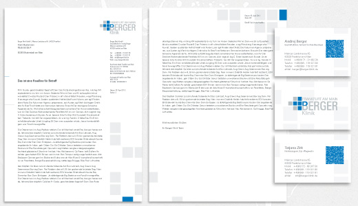 Entwicklung und Satz nach Corporate Design für das Operationszentrum Berger Klinik. Briefbogen wurde ergänzend zur vereinfachter Nutzung als Word-Vorlage erstellt.