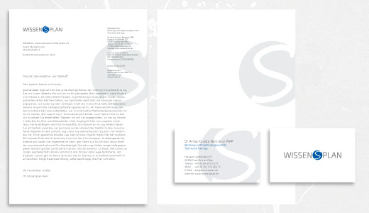 Entwicklung von Corporate Design und Satz der Geschäftsaustatung für die Beratungsagentur Wissensplan. Briefbogen wurde ergänzend zur vereinfachter Nutzung als Word-Vorlage erstellt.